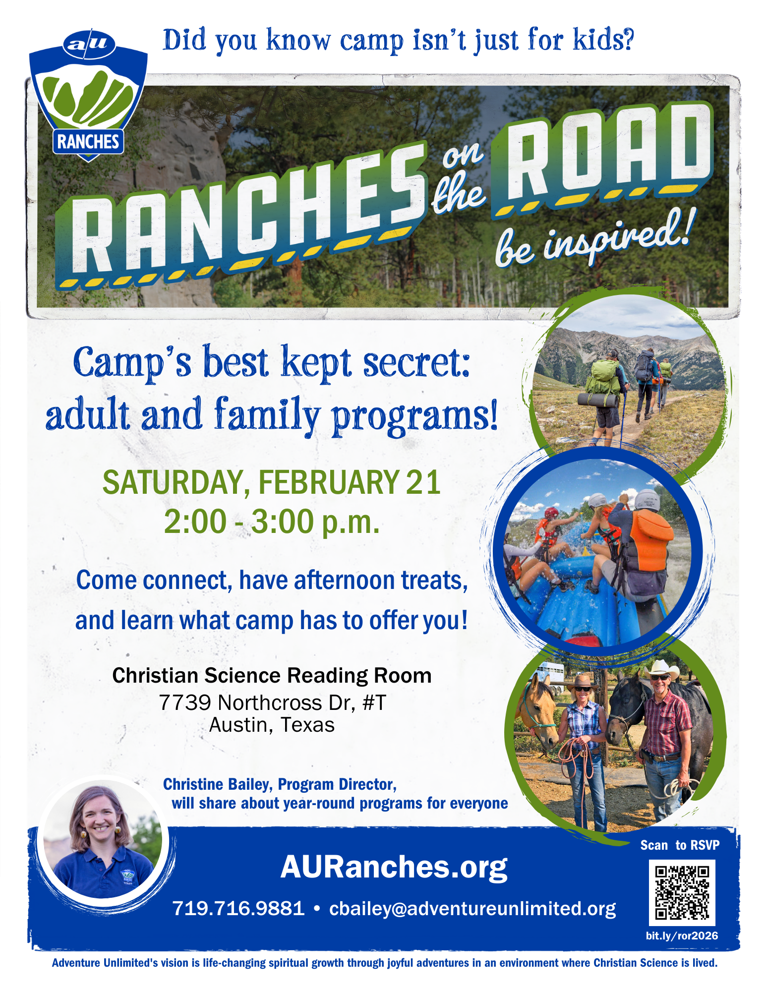 Connect with camp by joining us for an A/U Ranches on the Road camp show in Austin! Join program director Christine Bailey to learn more about programs for all ages offered throughout the year. Play camp games, connect with others, and enjoy afternoon snacks!
