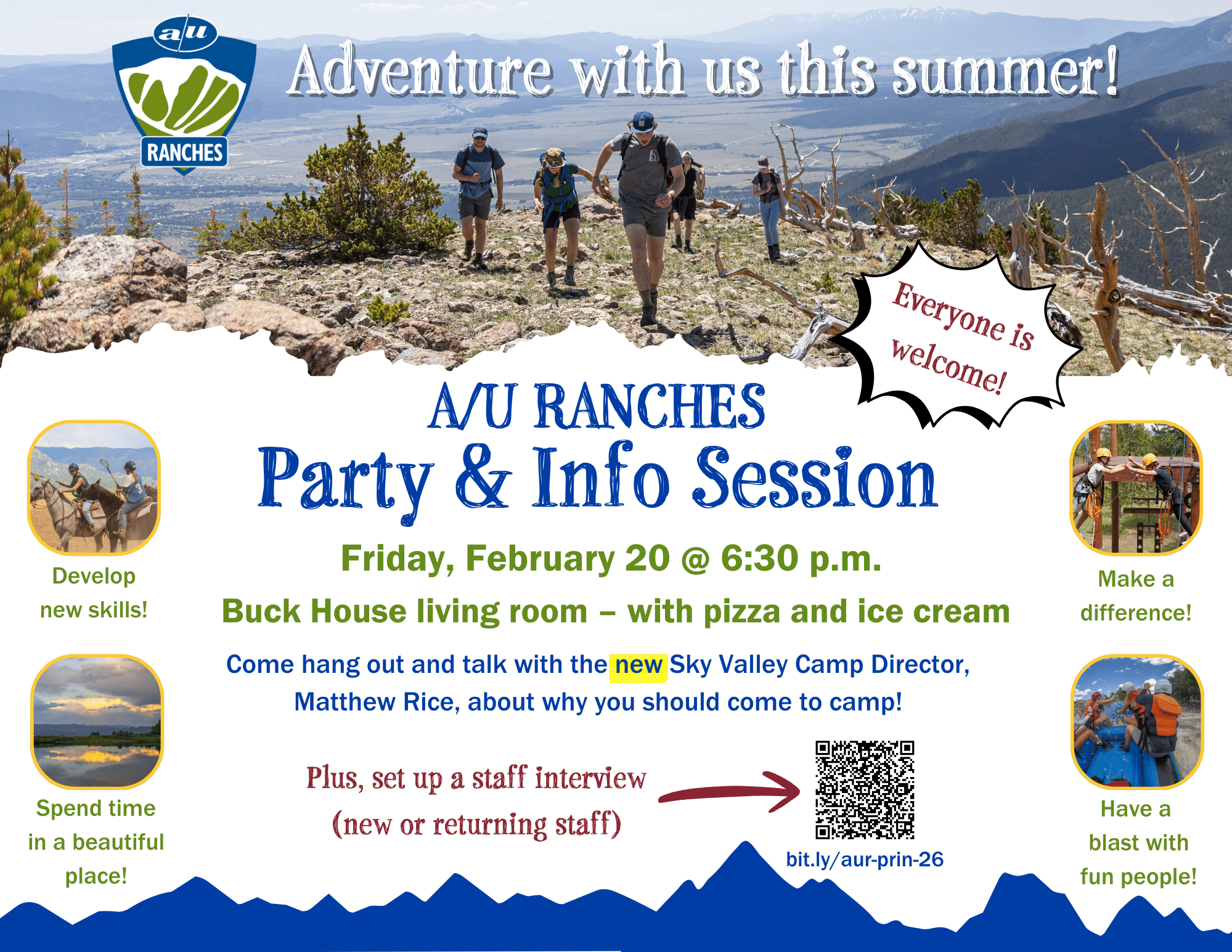 Do you want a fun and meaningful summer experience? Need an internship for your major? Come talk with Matthew, Sky Valley Camp Director, about opportunities for working at the A/U Ranches this summer!