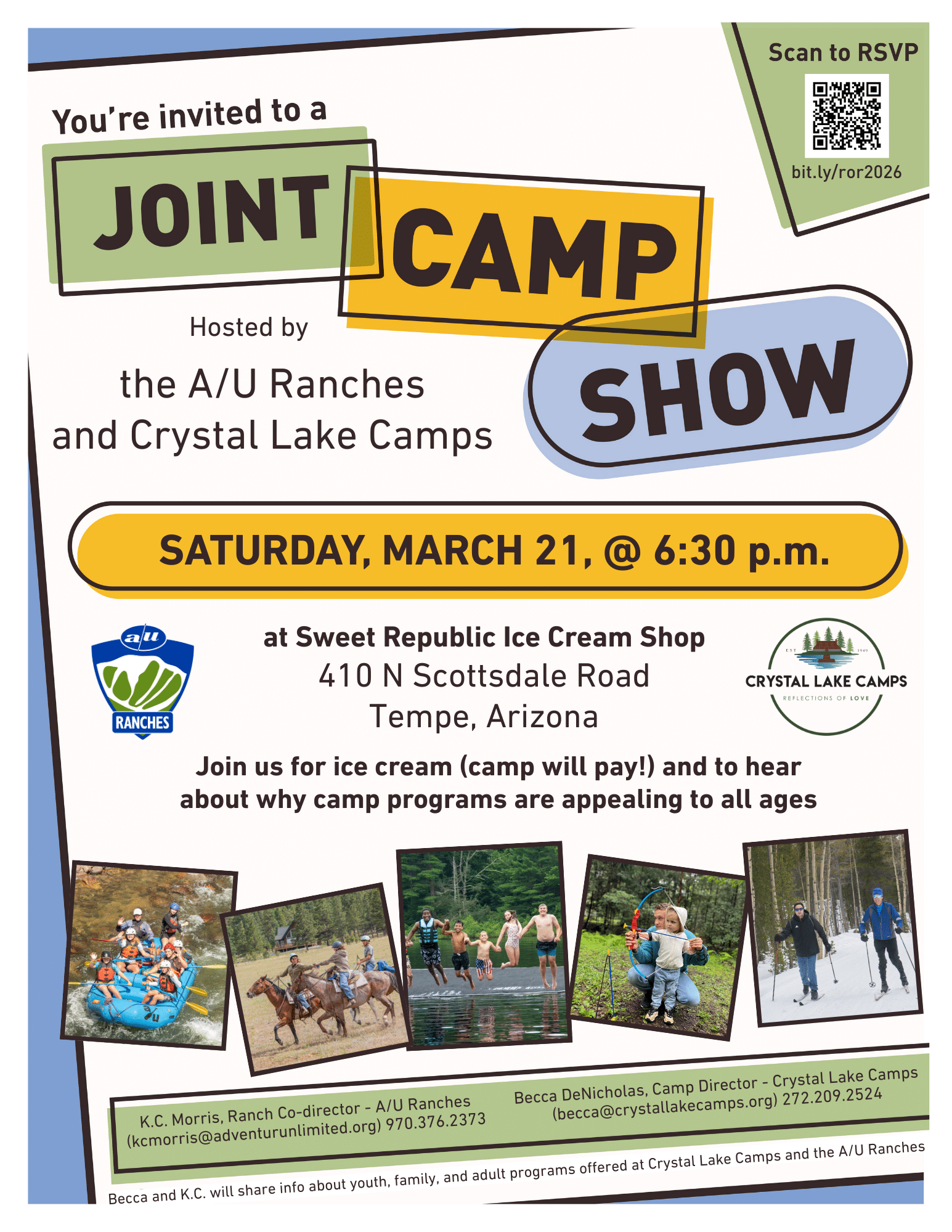 Join K.C. Morris, A/U Ranches Co-director, and Becca DeNicholas, Crystal Lake Camps Camp Director, for ice cream (camp will pay!) and to talk about what makes camp so fun for everyone.